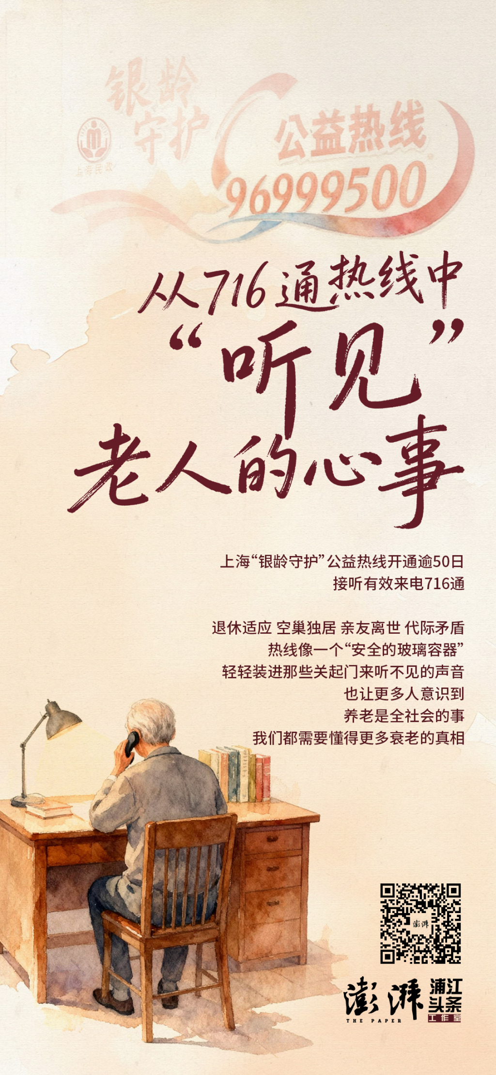 上海是全国老龄化程度最深的城市之一,平均每三个户籍人口中就有一位是老年人。退休适应、空巢独居、健康衰退、亲友离世、代际矛盾……热线像一个“安全的玻璃容器”,轻轻装进那些关起门来听不见的老人声音。